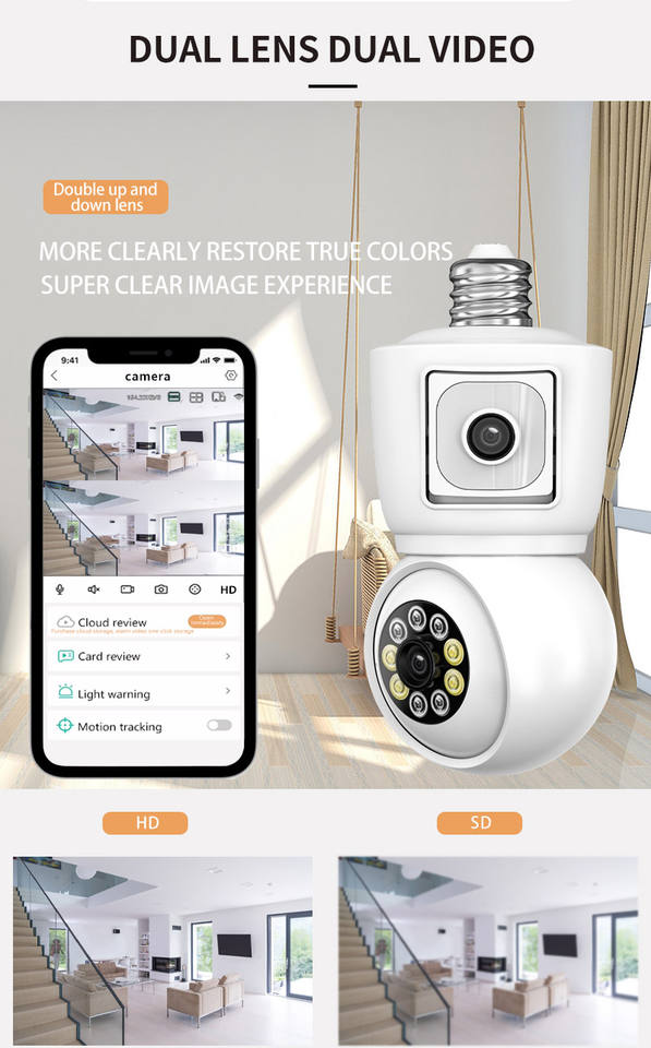 ICSEE double lentille E27 lampe ampoule WIFI PTZ sans fil lumière LED caméra 4MP 6MP mouvement alarme sécurité maison caméra intelligente 360 degrés