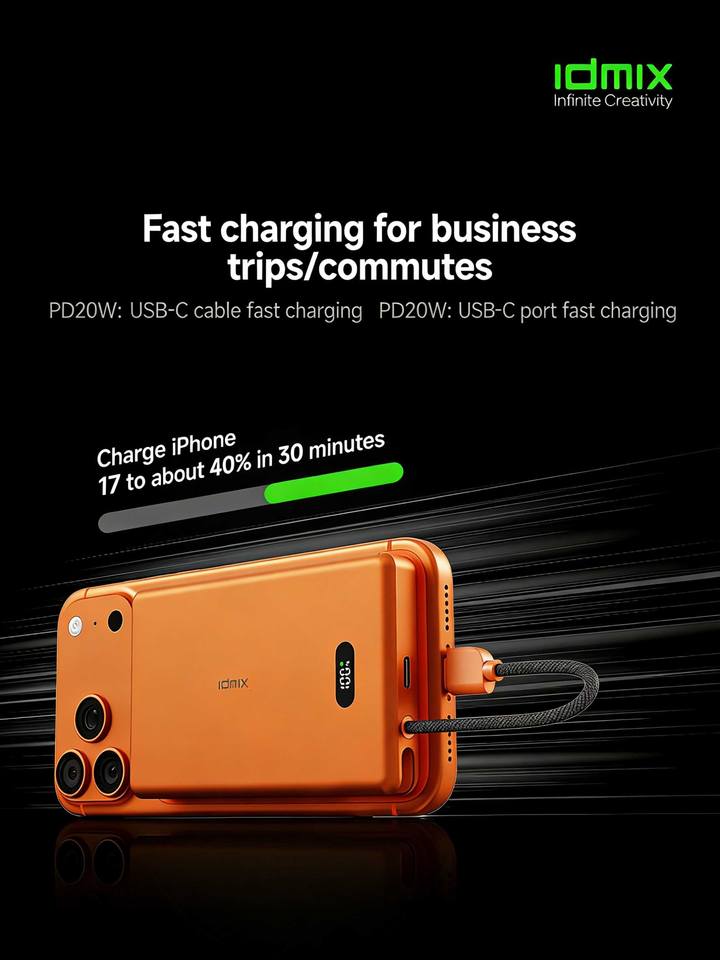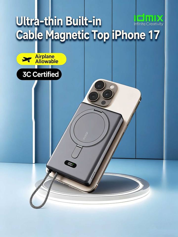 Batterie externe magnétique sans fil IDMIX 15W 10000mAh avec câble intégré pour iPhone 16/17 Series – Pack de batterie portable