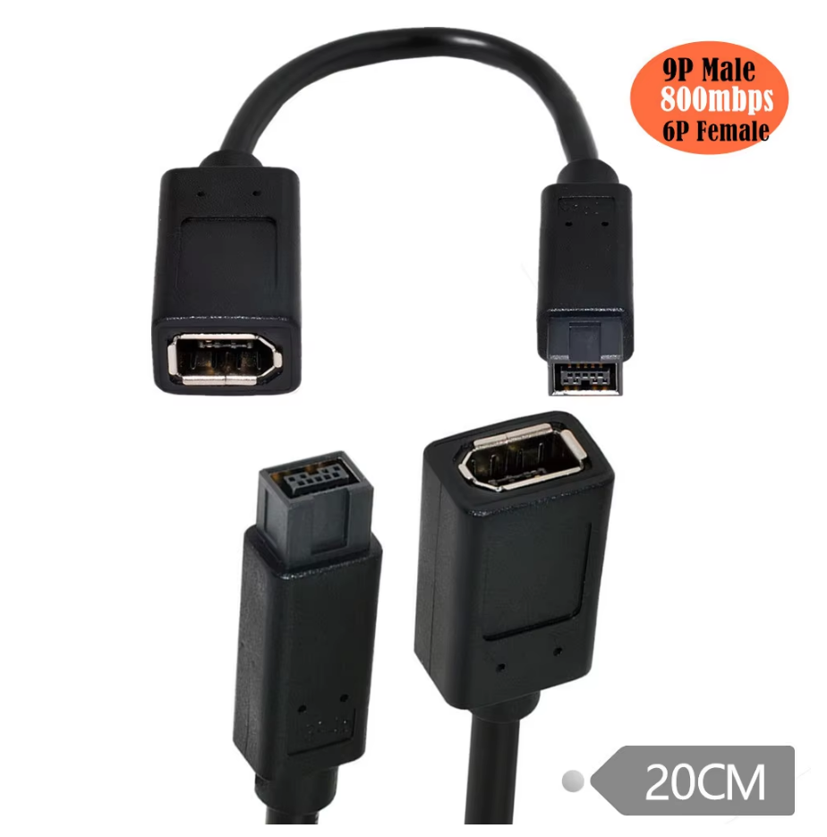 Câble IEEE 1394 1394b 9 broches mâle vers 1394 6 broches femelle Firewire 400/800 20 cm de longueur en cuivre pur avec gaine en PVC pour appareils photo et ordinateurs