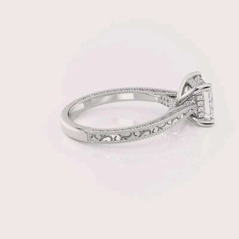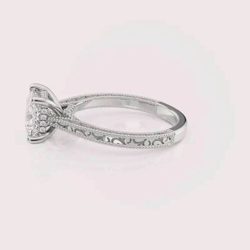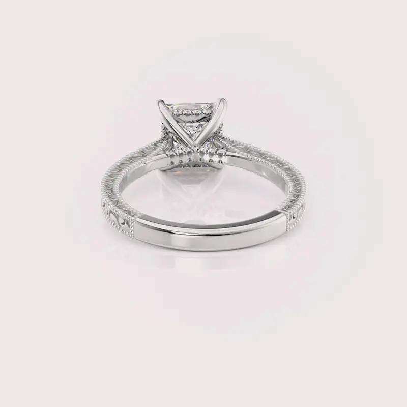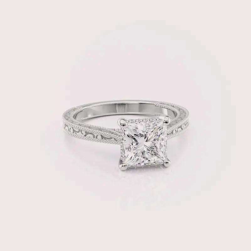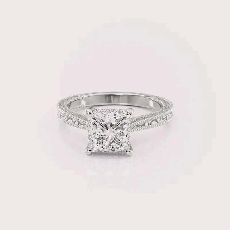 Bague de fiançailles en diamant de laboratoire de forme princesse certifiée IGI, gravée de motifs floraux vintage, en argent sterling 925 massif
