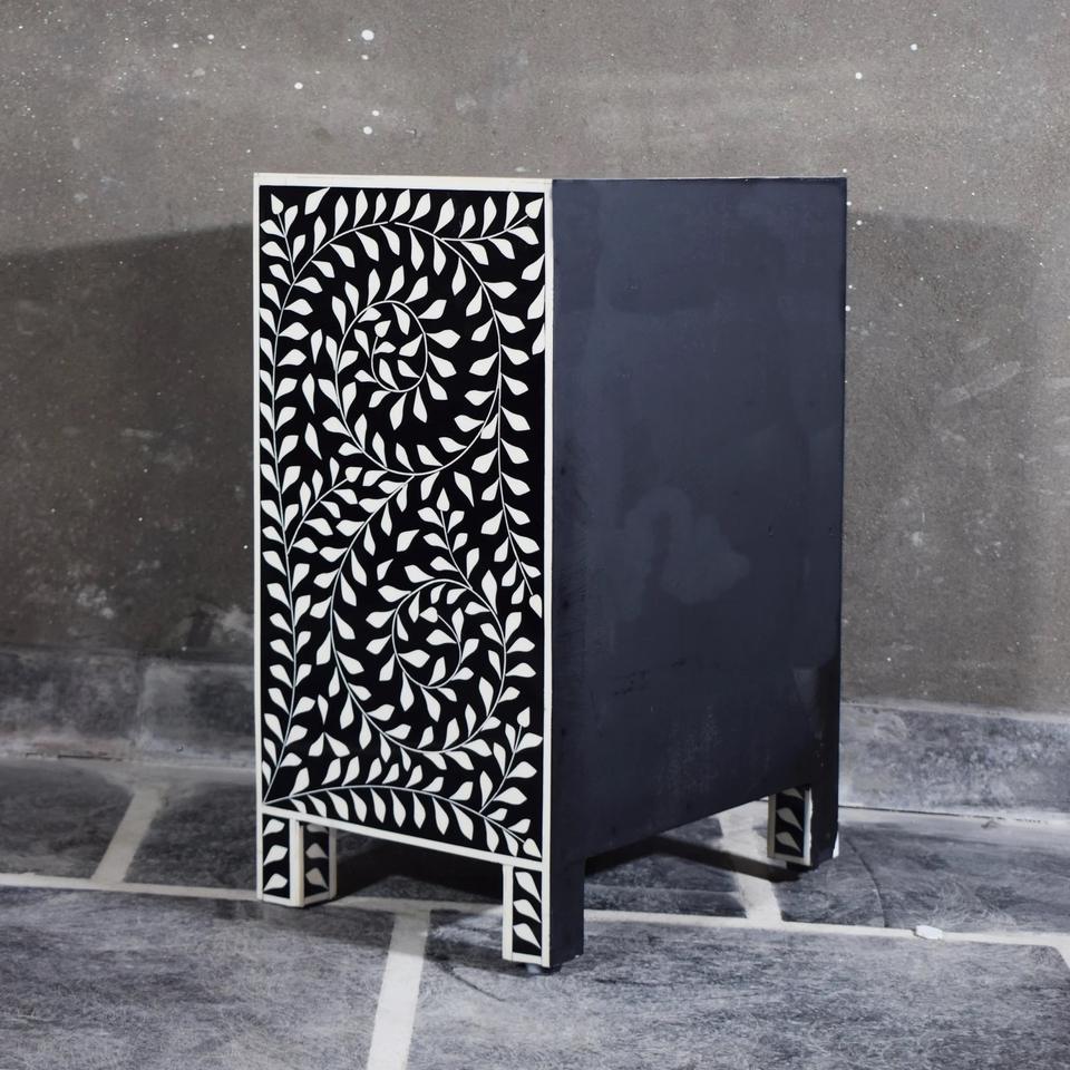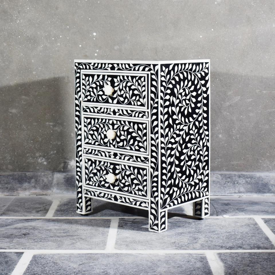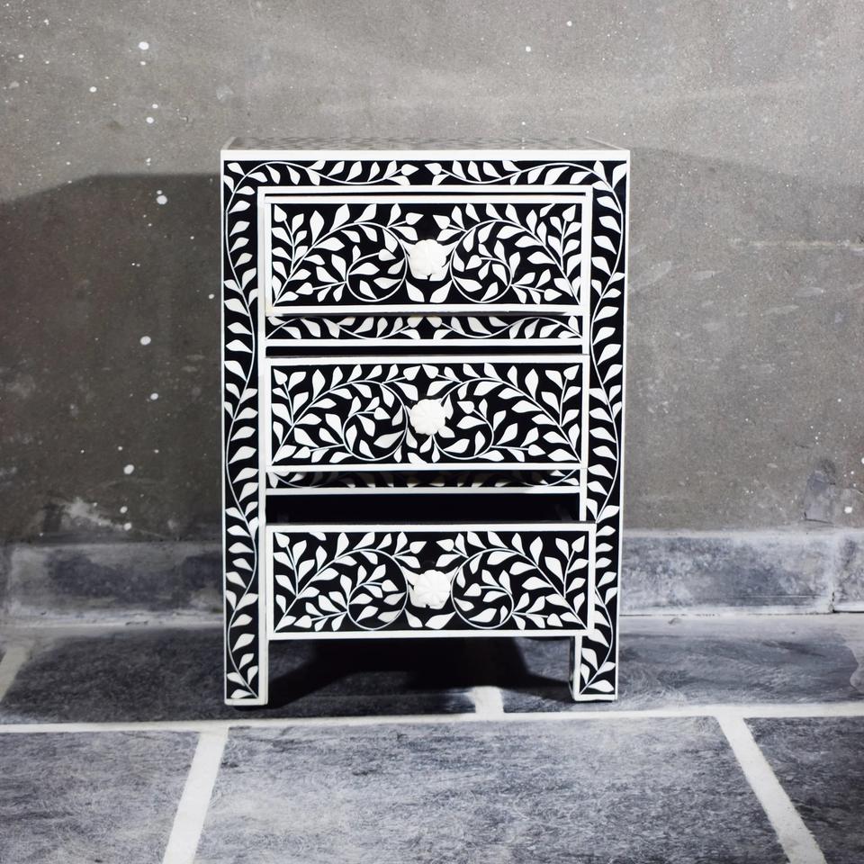 Table à tiroirs en os incrusté de la marque ILAHI, design moderne, détails en agate, rangement à trois niveaux, meuble portable pour la maison