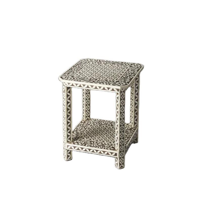Table à tiroirs en os incrusté de la marque ILAHI, design moderne, détails en agate, rangement à trois niveaux, meuble portable pour la maison