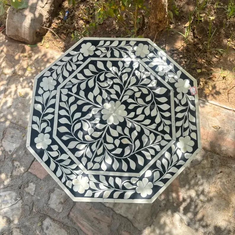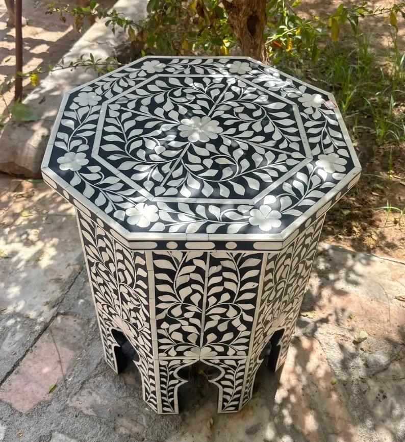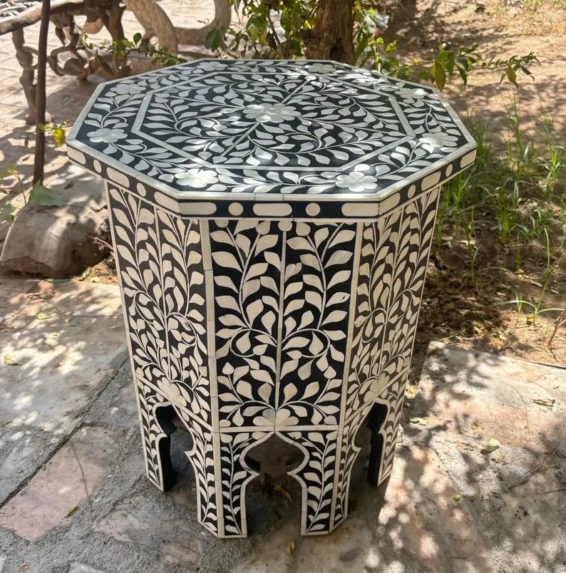 Table à tiroirs en os incrusté de la marque ILAHI, design moderne, détails en agate, rangement à trois niveaux, meuble portable pour la maison