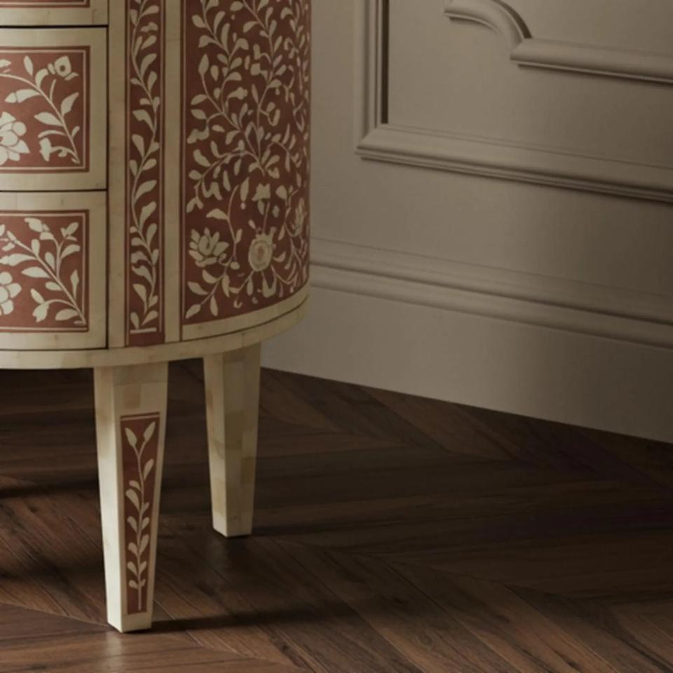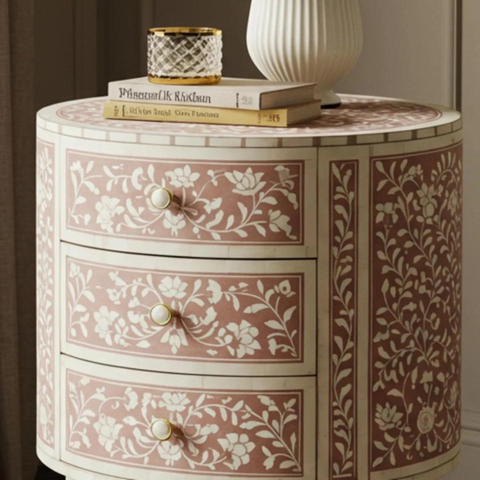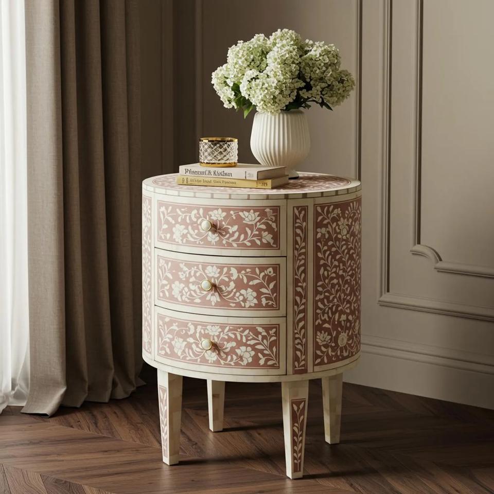 Table à tiroirs en os incrusté de la marque ILAHI, design moderne, détails en agate, rangement à trois niveaux, meuble portable pour la maison