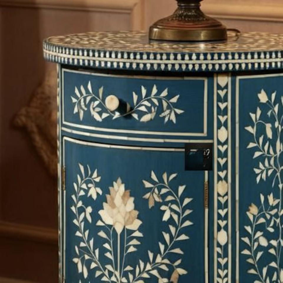 Table à tiroirs en os incrusté de la marque ILAHI, design moderne, détails en agate, rangement à trois niveaux, meuble portable pour la maison