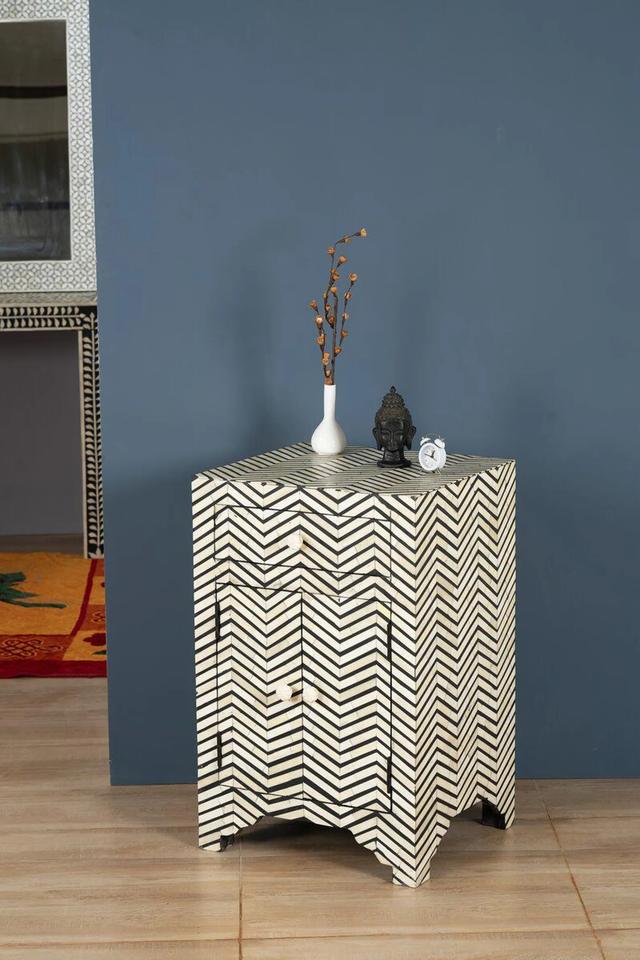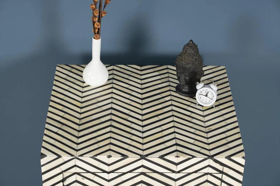 Table à tiroirs en os incrusté de la marque ILAHI, design moderne, détails en agate, rangement à trois niveaux, meuble portable pour la maison
