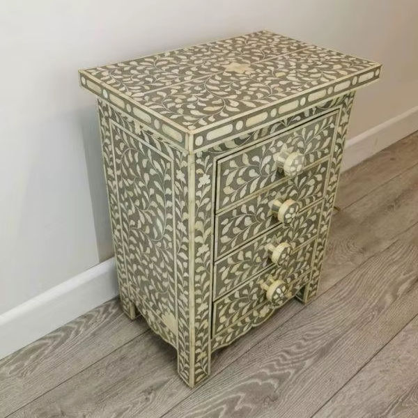 Table à tiroirs en os incrusté de la marque ILAHI, design moderne, détails en agate, rangement à trois niveaux, meuble portable pour la maison