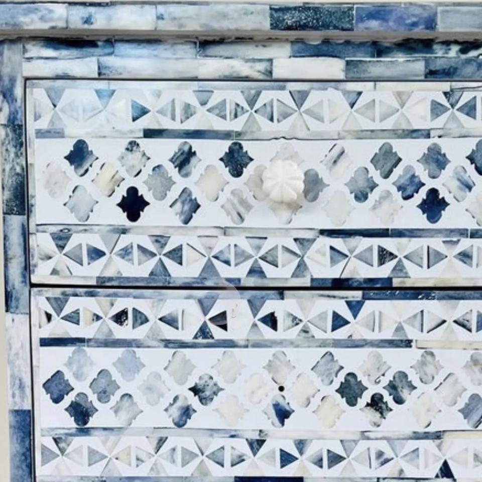 Table à tiroirs en os incrusté de la marque ILAHI, design moderne, détails en agate, rangement à trois niveaux, meuble portable pour la maison