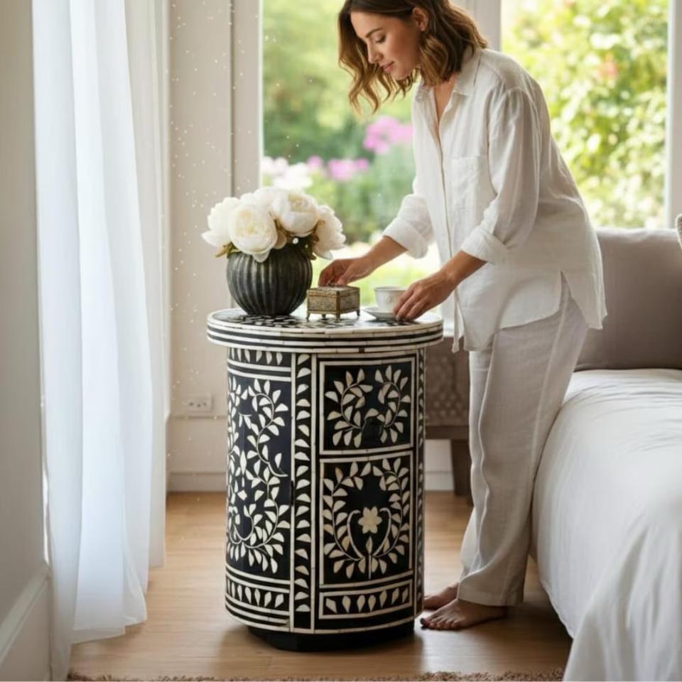 Table à tiroirs en os incrusté de la marque ILAHI, design moderne, détails en agate, rangement à trois niveaux, meuble portable pour la maison