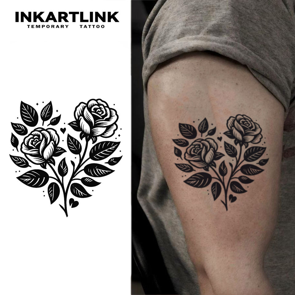 INKARTLINK Autocollant de tatouage semi-permanent Cœur Rose Jumelle, motif floral vintage et botanique, tenue 15 jours, pour bras et épaule, vente en gros