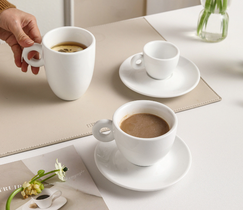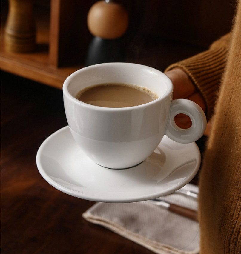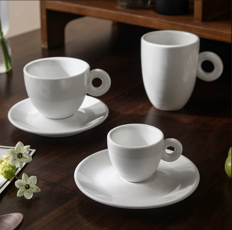 Ensemble tasse et soucoupe en céramique blanche avec poignée en forme de donut, style minimaliste, pour expresso et cappuccino, idéal pour hôtels, cafés et restaurants (vente en gros)
