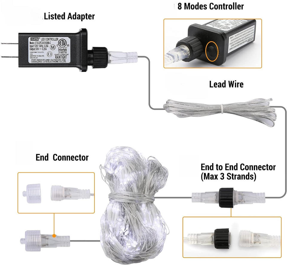 IP65 étanche 24V prise blanc chaud lumières de noël pour arbres buissons arbustes maille lumières connectable à distance 8 lumière de noël
