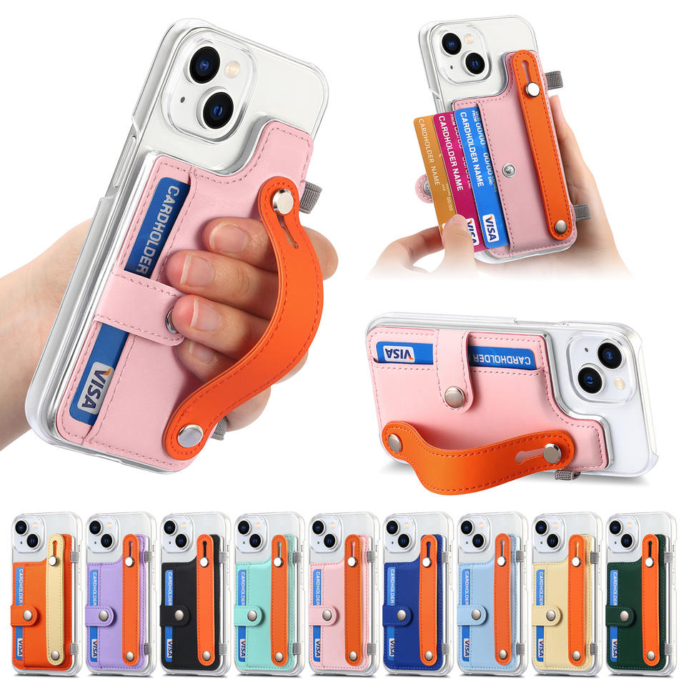 Étui transparent en PU pour iPhone 16 avec fermeture à bouton pour cartes de crédit - Blocage RFID, support de poignet DIY de 50 mm d'épaisseur, couleur Macron assortie
