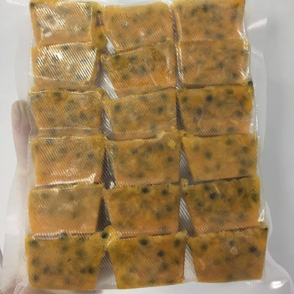 Cubes de jus de fruits de la passion congelés IQF avec emballage en vrac de graines pour la production de boissons de mélange de fruits de dessert de smoothie et l'approvisionnement alimentaire