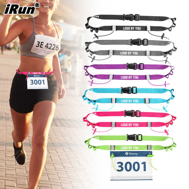 IRun Ceinture porte-dossard course réglable 25 mm 750–920 mm, polyester/spandex/nylon, réfléchissante, logo personnalisable, 10 pcs/lot