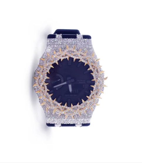 Montre ronde en acier inoxydable bleu marine glacé, lunette personnalisée entièrement dorée, résistance à l'eau 10 bars, cadran en verre, bracelet en acier inoxydable