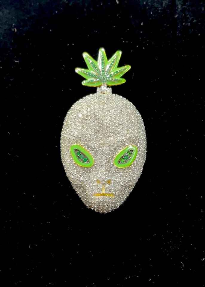Pendentif Hip Hop Personnalisé Luxe en Argent 925 Plaqué Rhodium/Or, Motif Visage d'Alien Sertie de Moissanite Ronde VVS Luminescente dans le Noir
