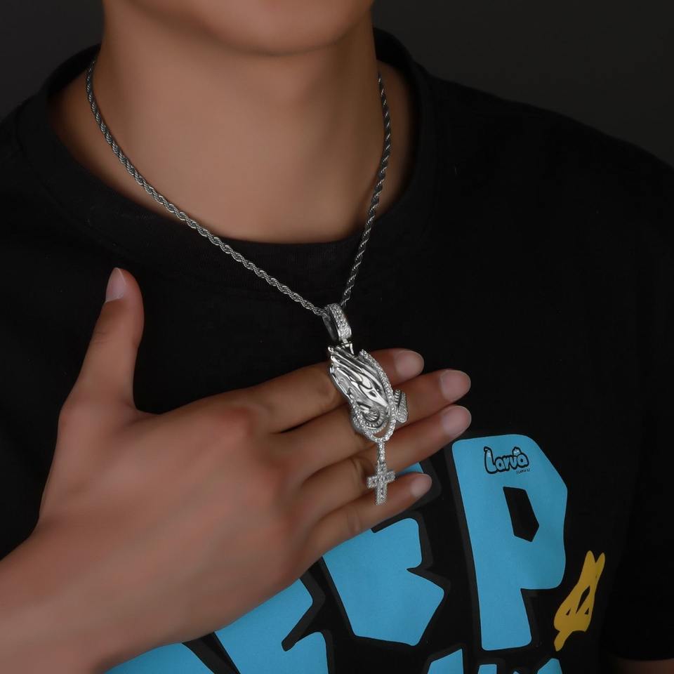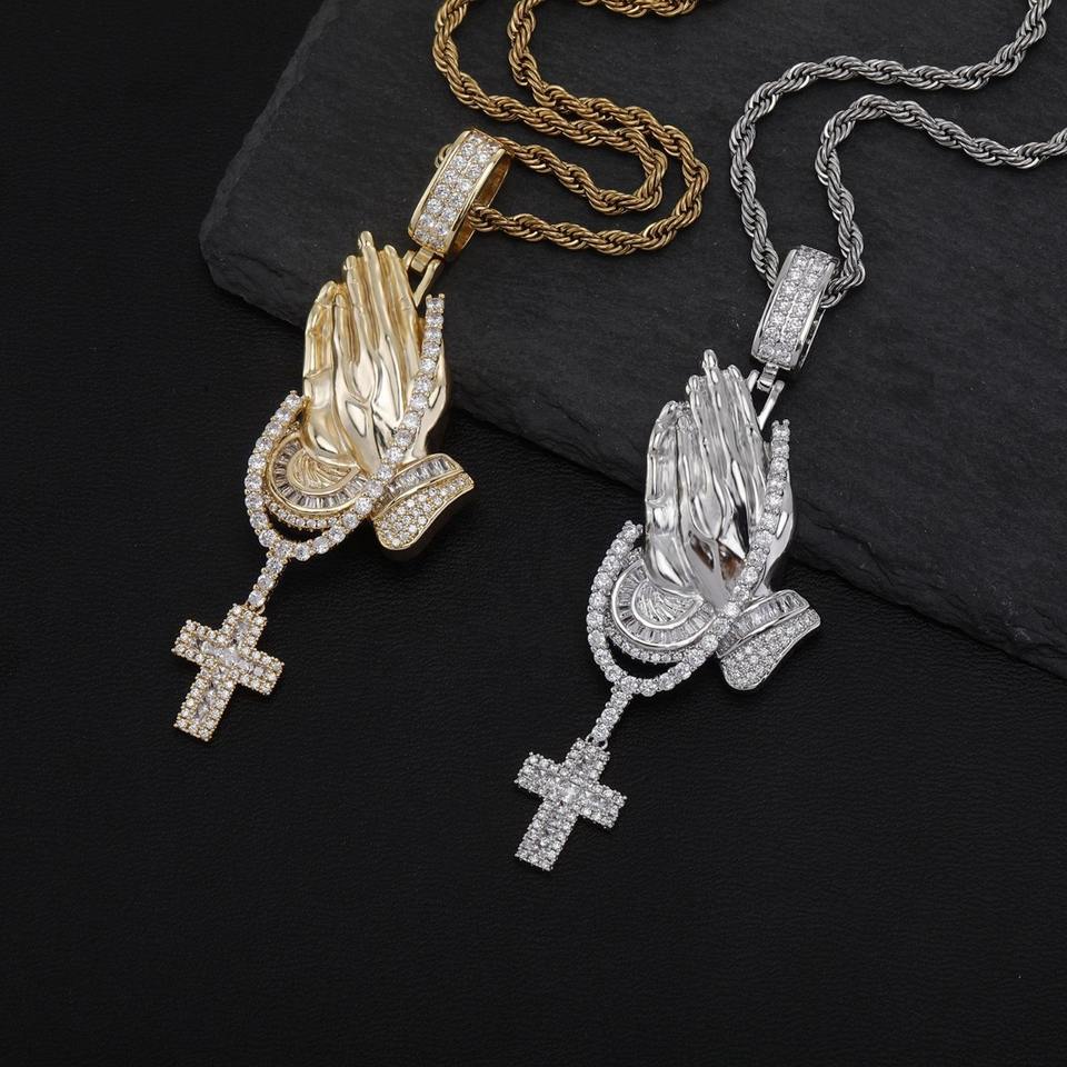 Collier Pendentif Croix Mains en Prière Bling Bling Diamant Plaqué Or, Breloque Main de Prière pour Hommes et Femmes, Bijoux
