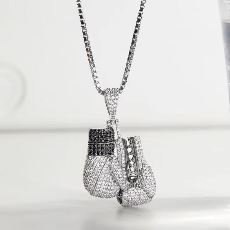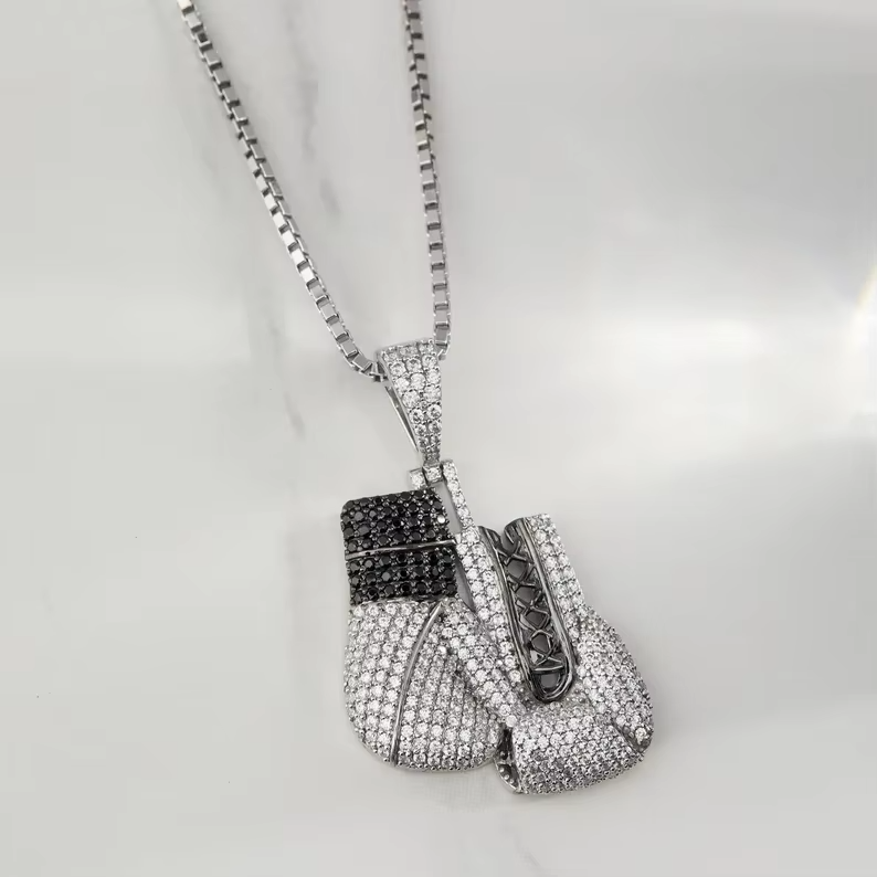 Pendentif Gants de Boxe Iced Out pour Hommes avec Pierres Noires et Blanches, Style Bijoux Hip Hop de Luxe