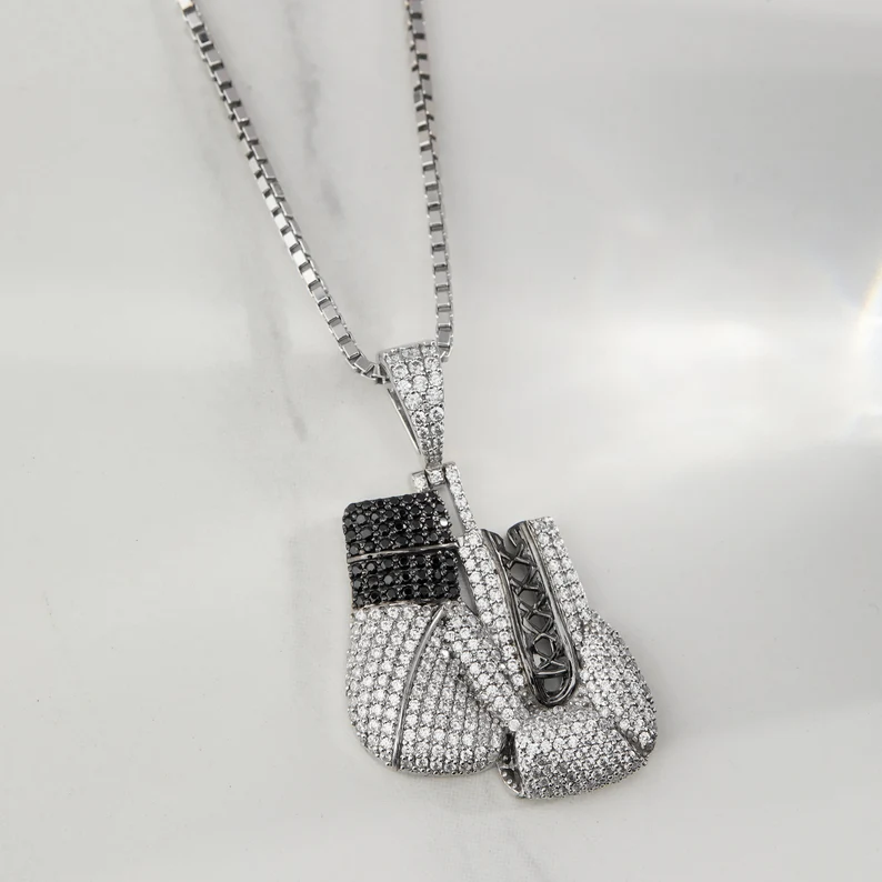 Pendentif de gants de boxe glacés pour hommes avec pierres noires et blanches dans le style de bijoux Hip Hop de luxe