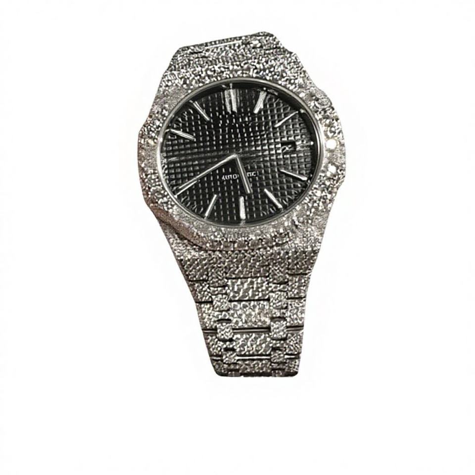 Montre Hip Hop Iced Out en Acier Inoxydable et Moissanite avec Fermoir Bracelet, Résistance à l'Eau 10 Bar