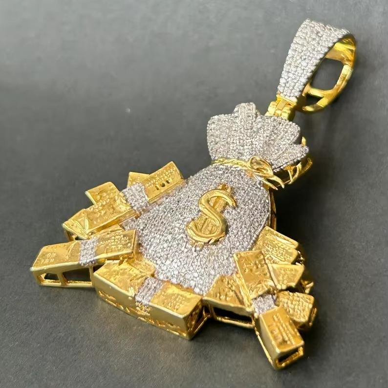 Pendentif Sac d'argent style Hip Hop Iced Out unisexe, plaqué argent finition or, motif signe dollar, serti de pierres Moissanite, pour soirée