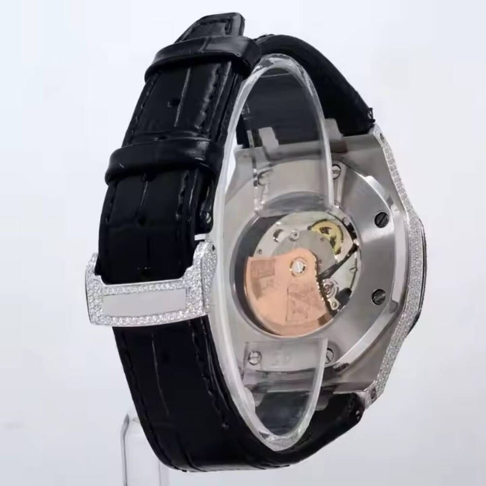 Montre ronde en moissanite fabriquée en diamant personnalisée pour hommes, bracelet en cuir noir, montre en diamant pour hommes.