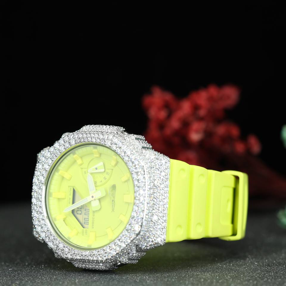 Montre Icevector GA2100 Custom Mod, boîtier en acier serti de pierres, finition miroir, luxe, conversion CasiOak, assemblage g&shock.
