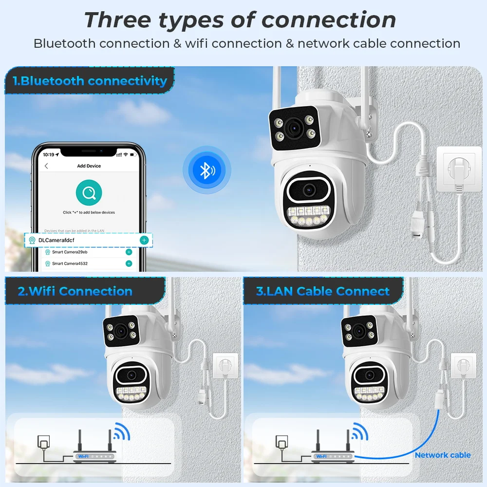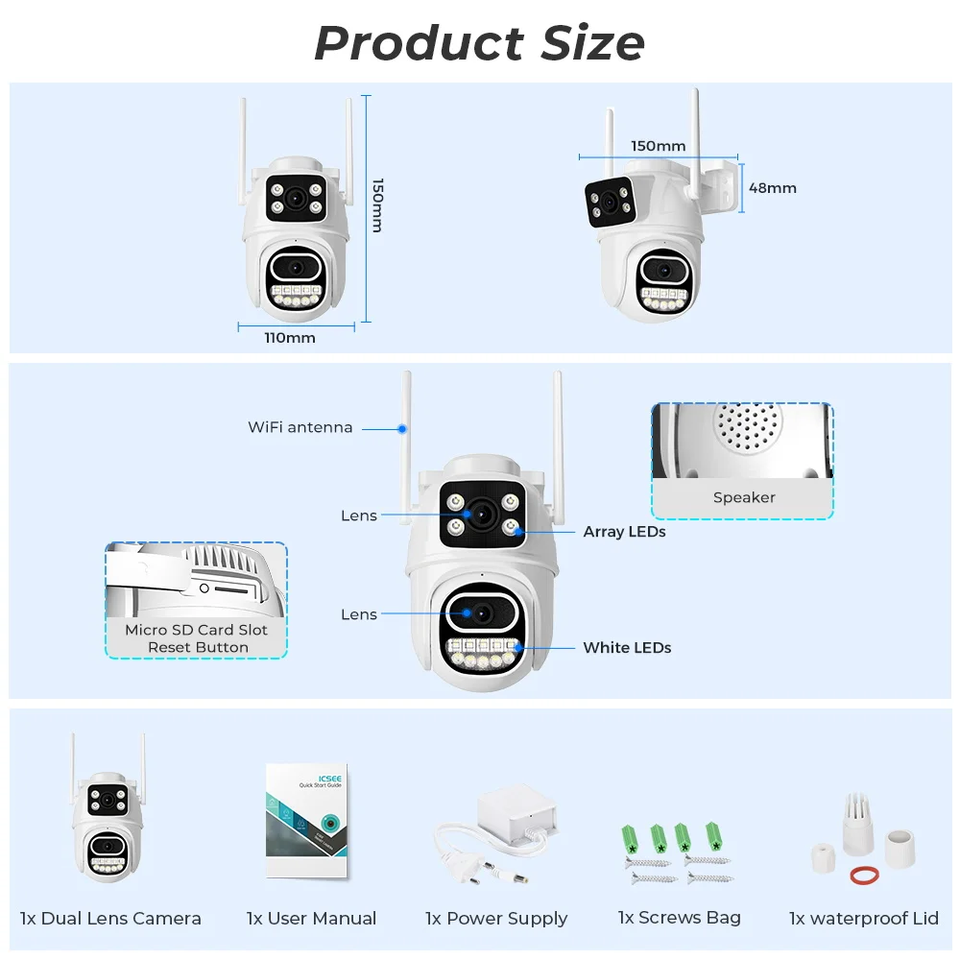 Fonction:Audio bidirectionnel, PAN-TILT, RESET, Micro intégré, Vision nocturne, Imperméabilisez/protégez contre les intempéries, Built-in Sirène