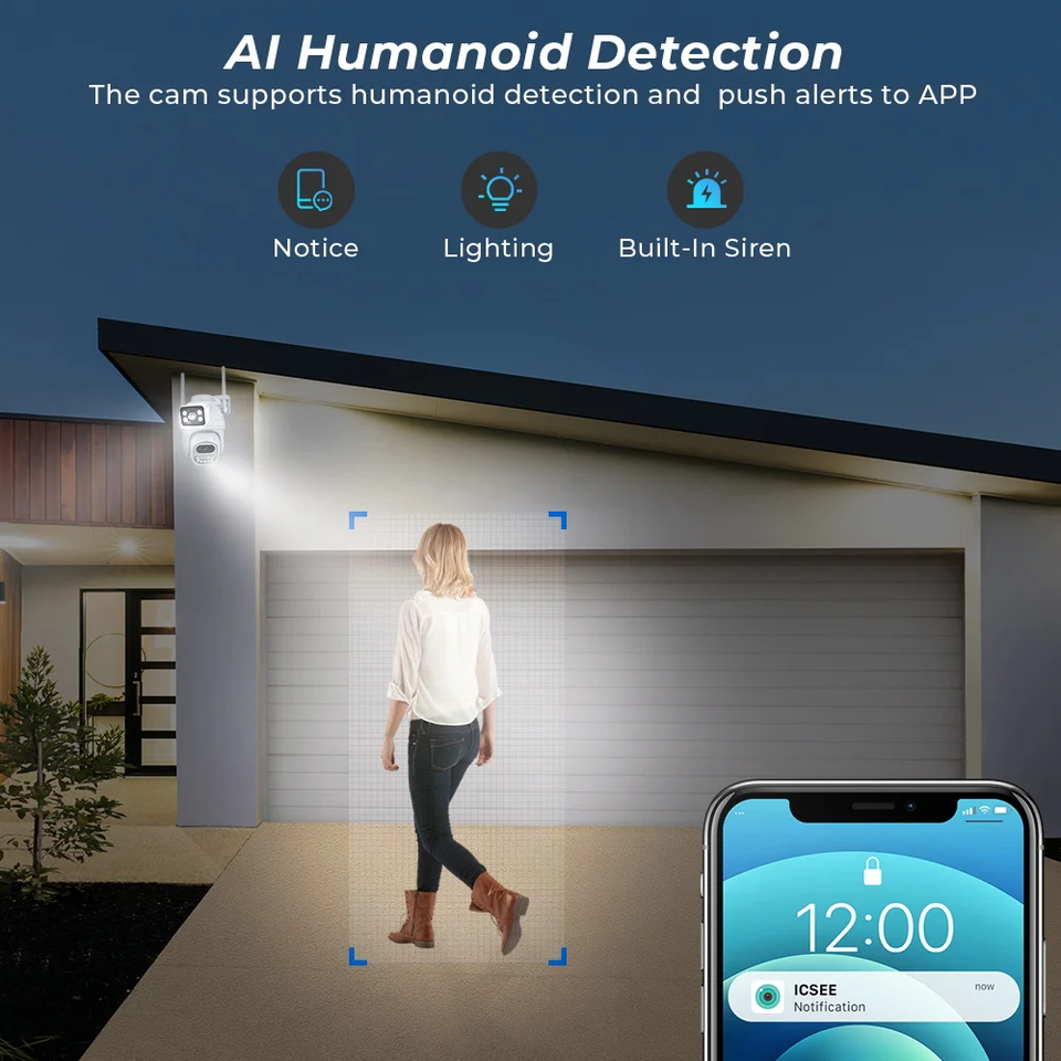 Caméra WiFi miniature Icsee avec suivi automatique, détection de mouvement humain intelligente par IA, vision nocturne, caméra de sécurité extérieure PTZ avec stockage dans le cloud
