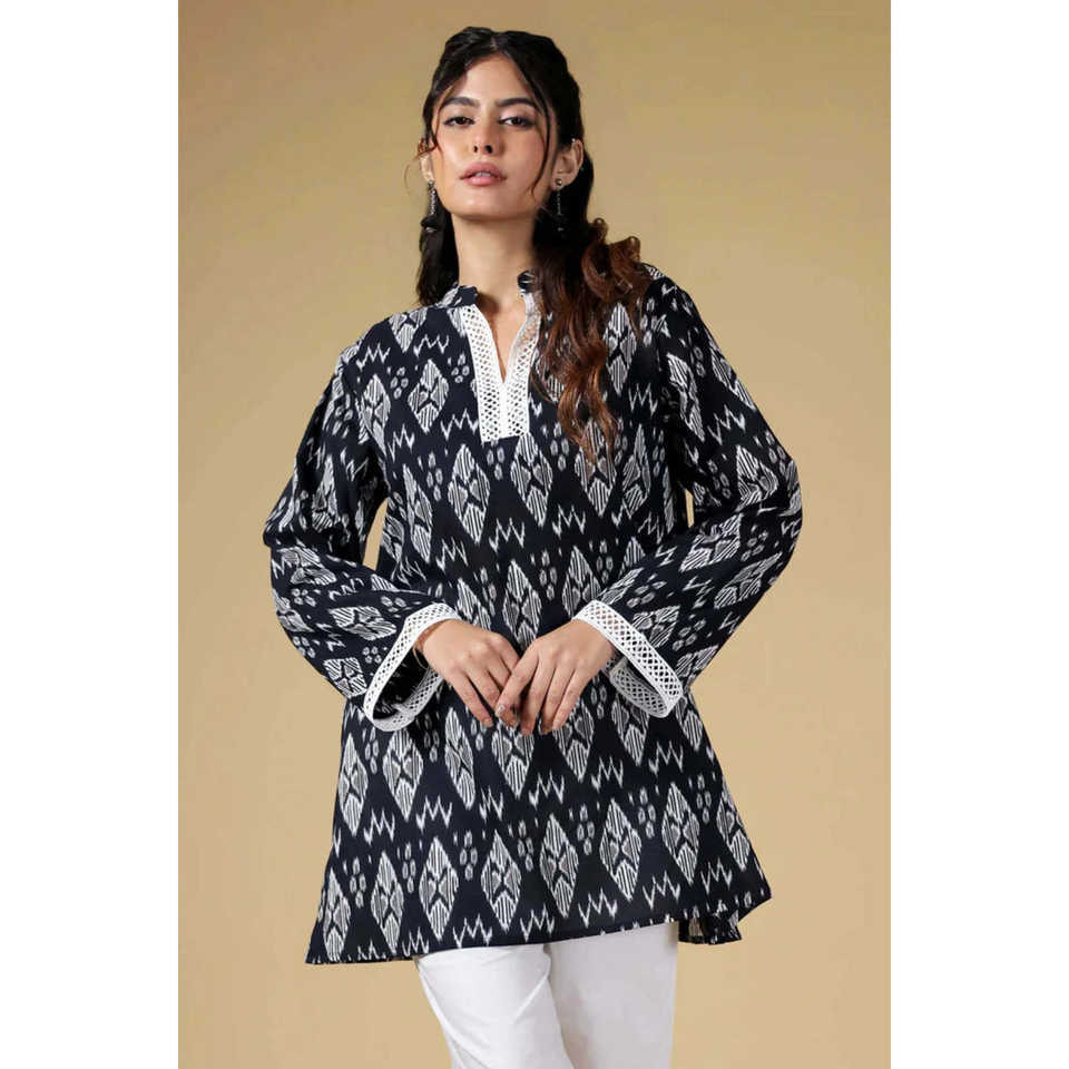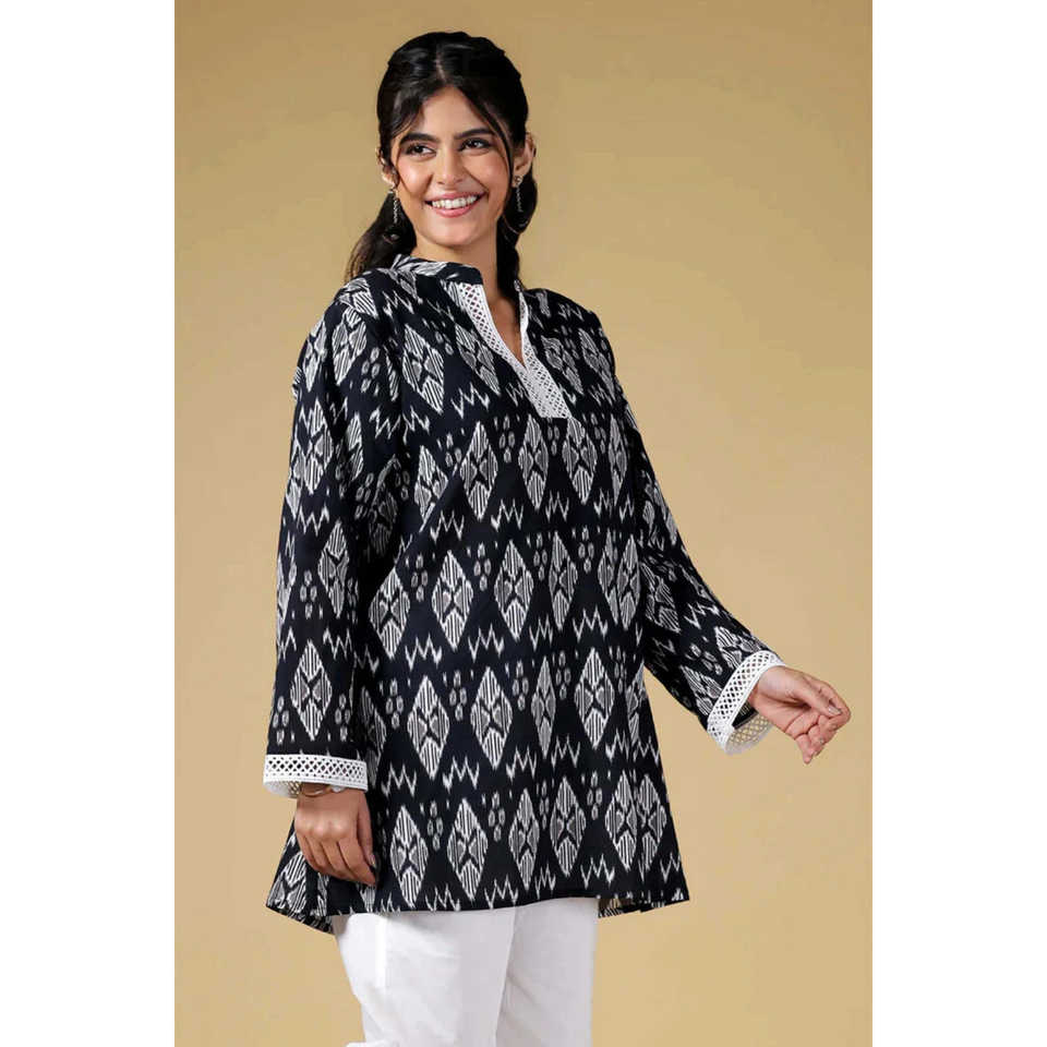 Top:A-Line Tunic With Mandarin Collar And Lace Detail On Neckline