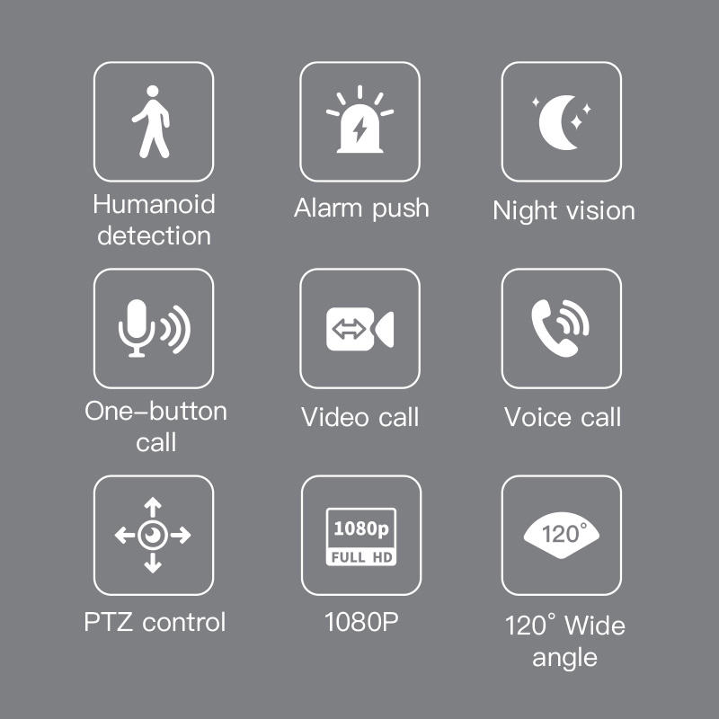 Audio bidirectionnel, PAN-TILT, RESET, Micro intégré, Vision nocturne, Grand Angle, Appel vidéo, Appel vocal, Caméra à APP Appel, Appel de caméra à caméra, Détection PleurantFonction