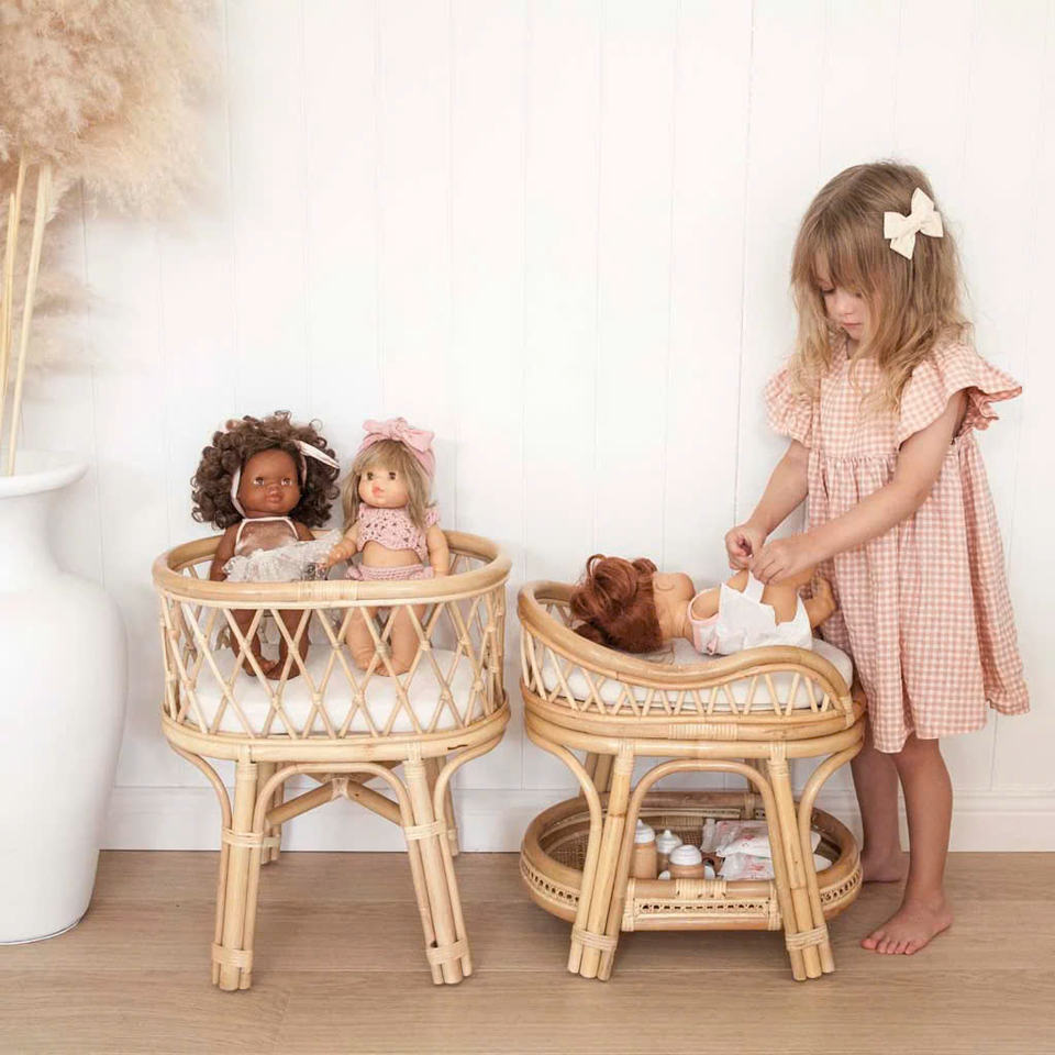 Images de l'atelier : Berceau pour poupées pour petites filles - Berceaux tissés en rotin naturel.