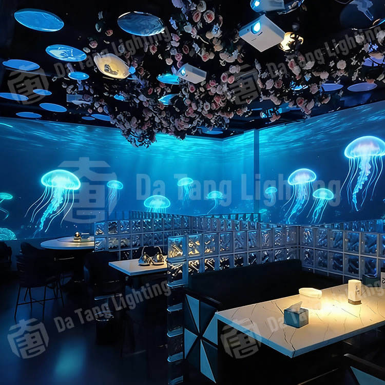 Système de projection immersive pour un environnement de restauration thématique avec des scènes visuelles dynamiques et une ambiance interactive