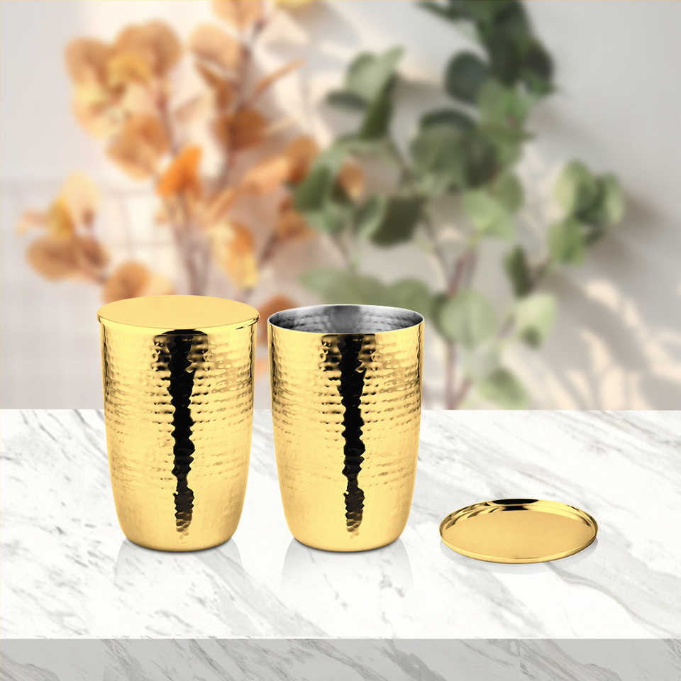 Design impressionnant 2 PCS Tasse à boisson en verre martelé en acier inoxydable avec revêtement en PVD doré et couvercle en acier inoxydable