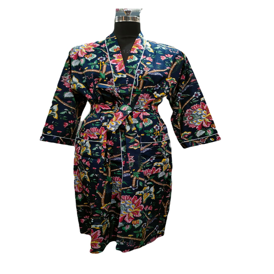 Au design floral bleu peignoirs de bain imprimés en blocs de coton 100% sur mesure, idéaux pour les designers et les fournisseurs de vêtements de villégiature