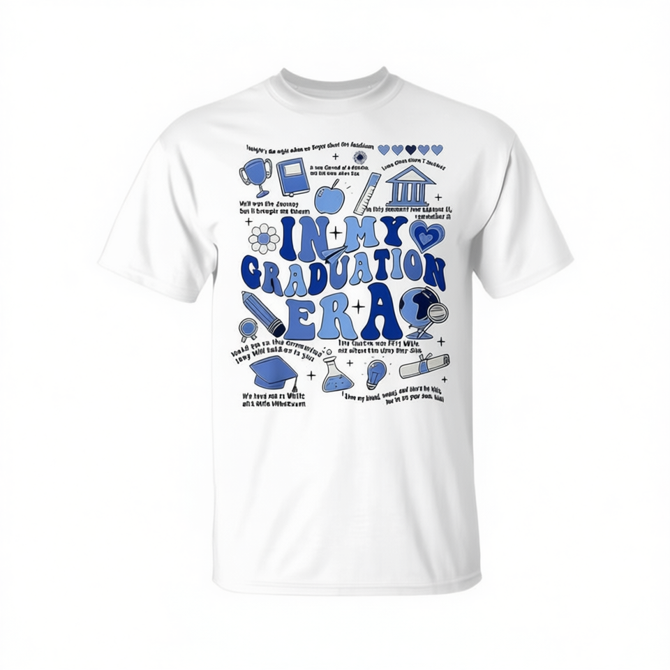 T-shirt In My Graduation Era blanc unisexe pour adulte, taille moyenne, col rond, manches courtes, impression numérique, pour la rentrée scolaire