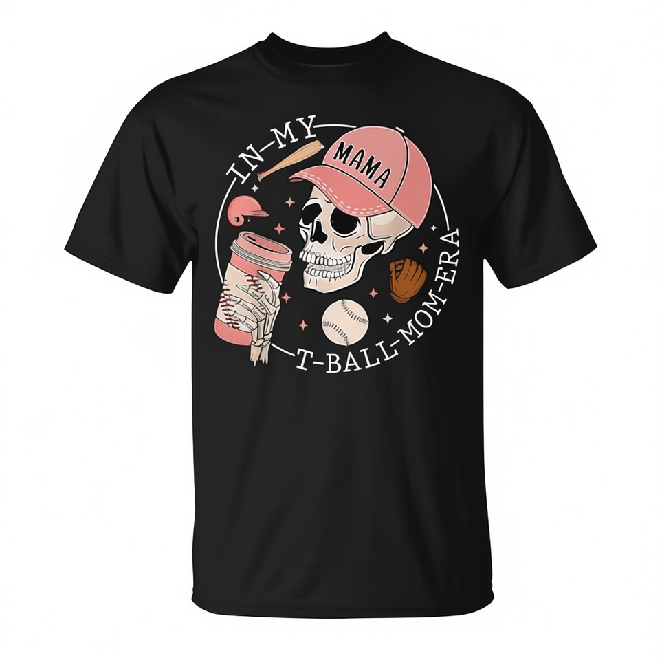 T-shirt pour femme In My T-Ball Mom Era Skeleton Baseball, col rond, manches courtes, impression numérique, cadeau sportif