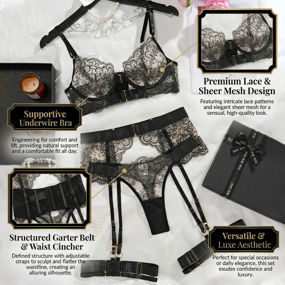En Stock 2026 Vente Flash Ensemble de Lingerie Sexy Transparente 4 Pièces, Broderie en Dentelle Œillet, Lingerie de Luxe Translucide Sculptante pour Femme