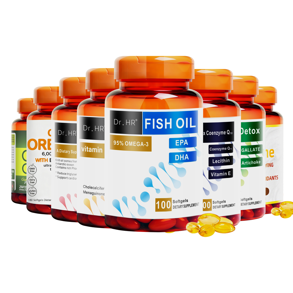1.Santé du foie : l'extrait de chardon-Marie soutient le métabolisme et la protection du foie 2.Blanchiment de la peau : le glutathion inhibe la production de mélanine et éclaircit le teint 3.Soutien du cœur et du cerveau : l'huile de krill, l'huile de poisson et le CoQ10 fournissent des oméga-3 pour maintenir la santé cardiovasculaire et cérébrale 4.Renforcement de l'immunité : L'huile de nigelle, l'huile d'origan, l'huile d'ail et les vitamines améliorent la fonction immunitaire 5.Nutrition complète : Les multivitamines couvrent les nutriments essentiels quotidiens pour une supplémentation équilibrée.