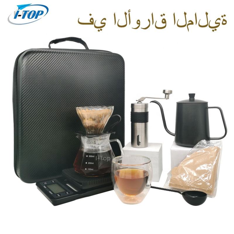 En stock, ensemble d'accessoires pour cafetière, voyage en plein air, moulin manuel, cafetière goutte à goutte, bouilloire, sac de café, coffrets cadeaux