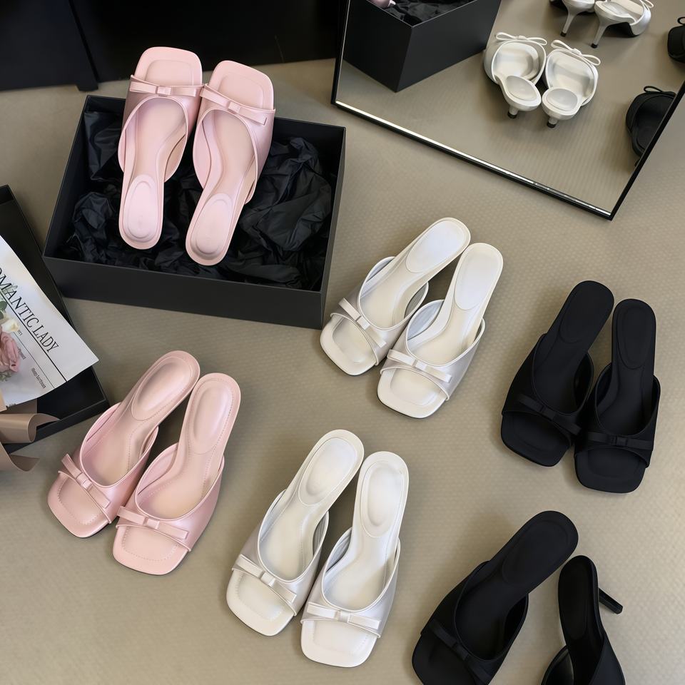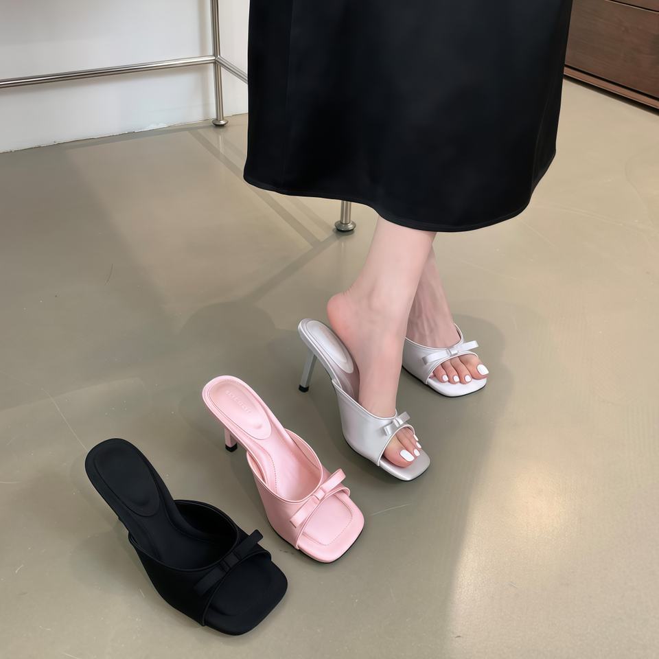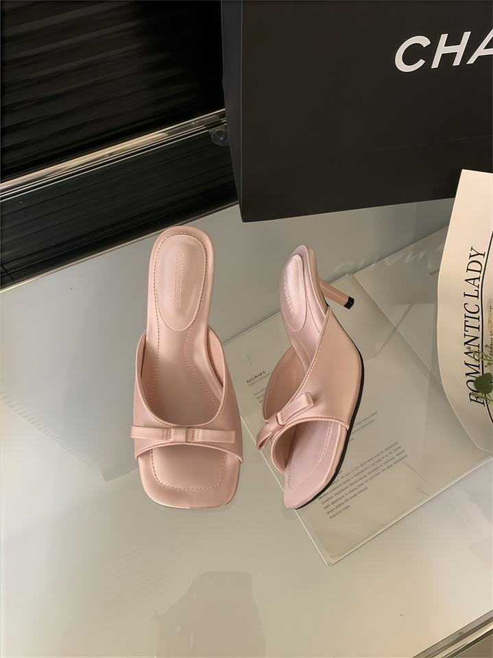 En stock Sandales d'été en soie à bout carré ouvertes, couleur unie, avec nœud, style féerique, semelle extérieure en caoutchouc, talons aiguilles