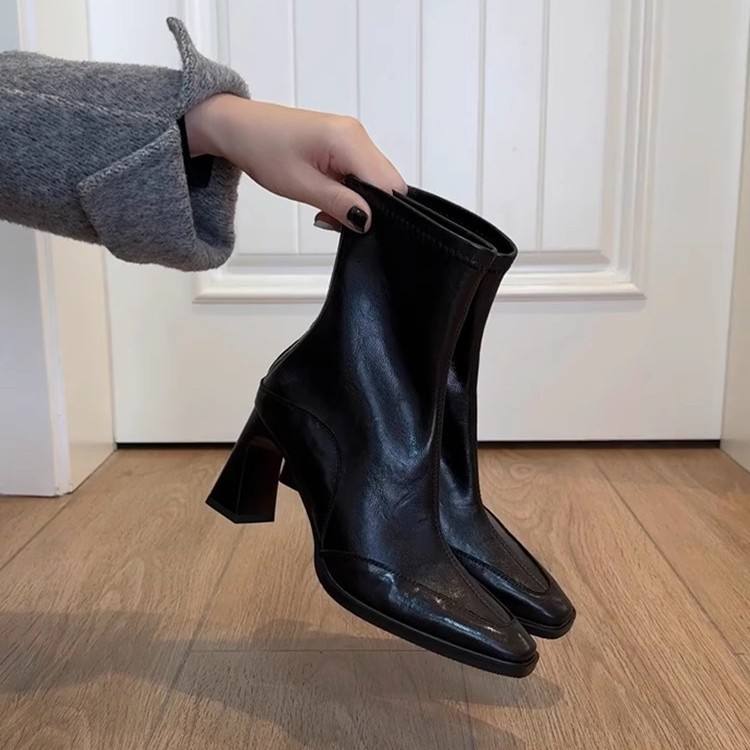 En stock, bottes fines rétro en cuir véritable à talon bloc et bout carré pour femmes, fermeture éclair arrière, talons hauts