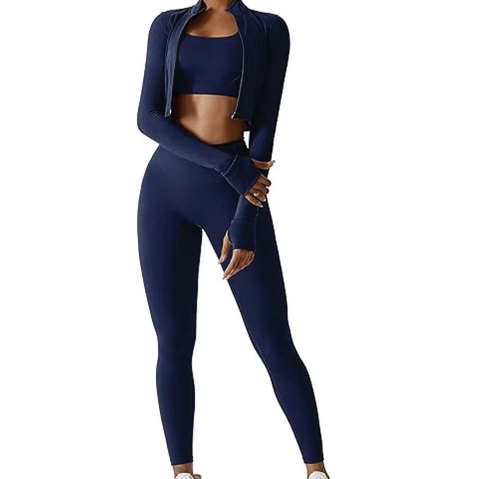 En stock, fabriqué au Pakistan, ensemble de yoga 3 pièces pour femmes, uni, devant uni, 100% coton, léger, respirant, vêtements de fitness, prix bas