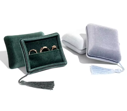 En stock, boîte à bijoux en velours rectangulaire moderne EleQueen EQ2035 avec pompon, emballage personnalisé avec logo pour bagues, bracelets, colliers