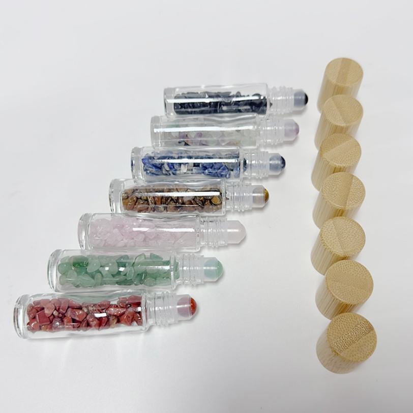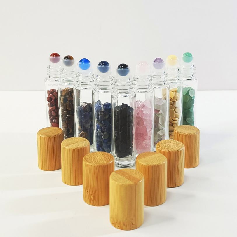 En stock, flacon en verre transparent avec couvercle en bambou, série de 10 ml, flacon en verre pour huile essentielle et parfum, avec bille en pierre précieuse