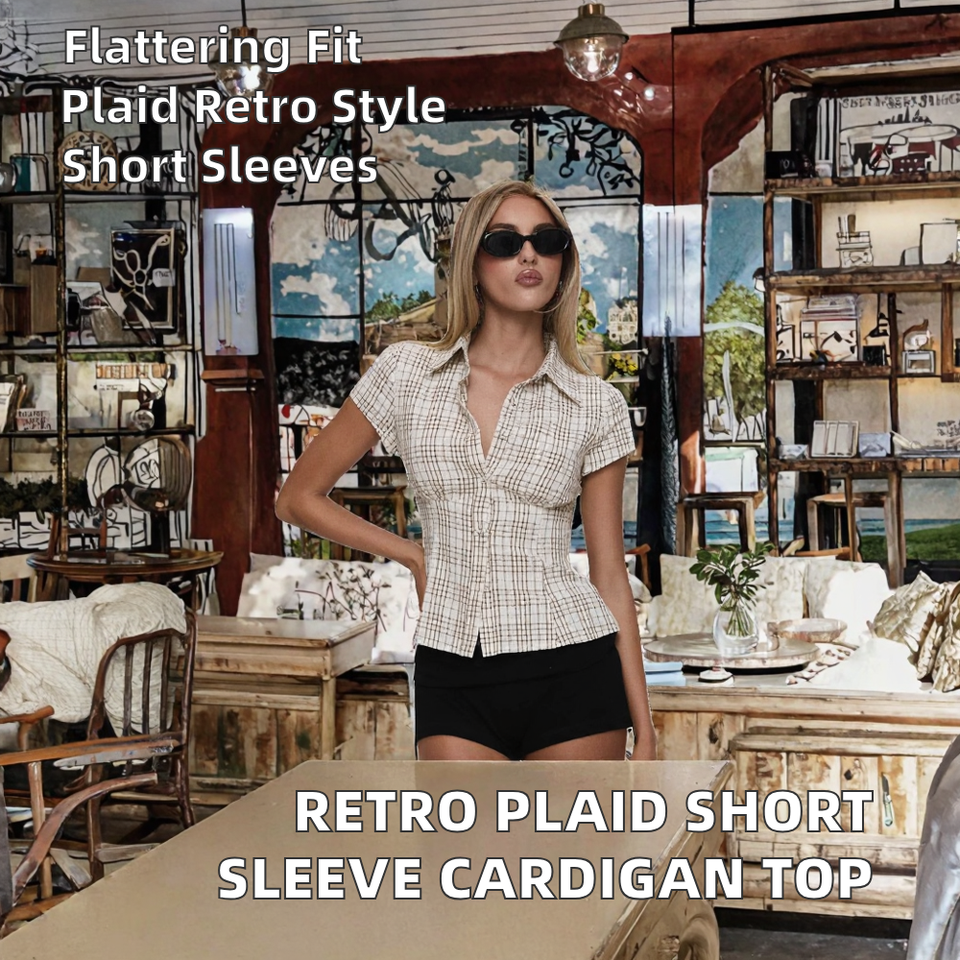 Independent Station Retro American Plaid Y2K Summer Slim Fit Silk/Cotton Shoulder Short Sleeve Cardigan Top Women's Clothing