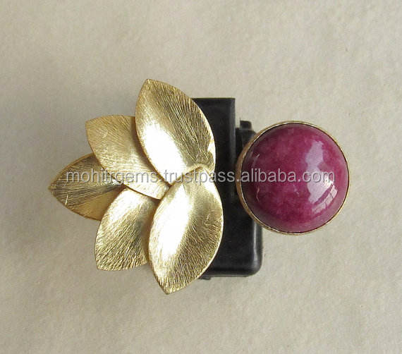 Bague indienne ajustable en corindon rose sans nickel, feuilles d'or, sertie gypsie, alliage, pierre précieuse rubis, taille unique pour enfants, fiançailles