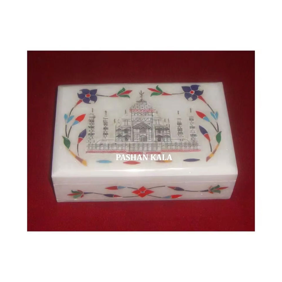 Boîte à bijoux Taj Mahal en marbre blanc pur incrusté de marbre blanc pur fait à la main par un meilleur designer indien pour la revente d'article