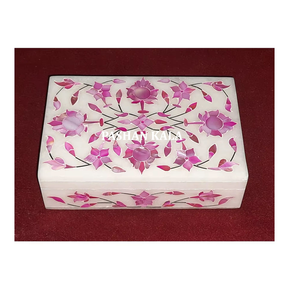 Indien meilleur concepteur fait à la main en marbre blanc pur forme rectangulaire rose nacre incrustation fleur conception bijoux boîte de rangement